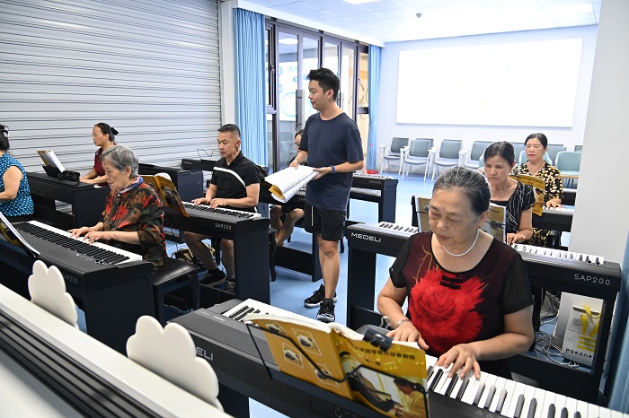 Keine leisen Töne: Diese Älteren schlagen unter Anleitung eines jungen Musiklehrers an einer Chongqinger Seniorenuniversität kräftig in die Tasten. (Foto: 19. September 2024)