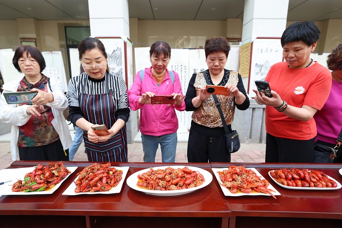 Flusskrebs-Fotos: Diese Teilnehmerinnen der Seniorenuniversität in Xiangyang in der Provinz Hubei lichten ihre Kochergebnisse ab. (Foto: 13. Mai 2025)