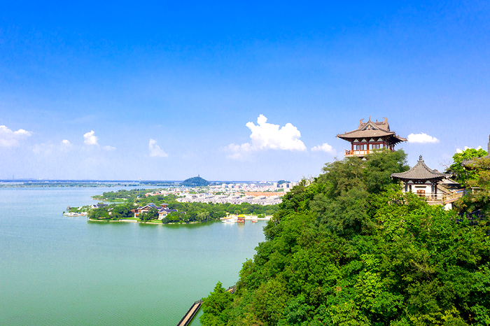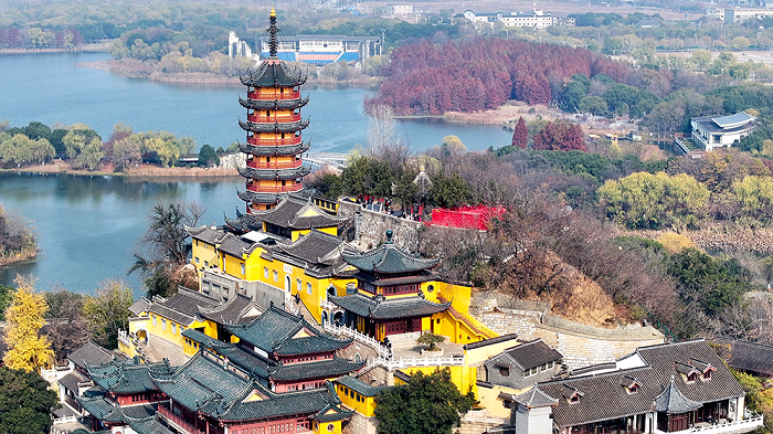 Tradition trifft Moderne: Der alte Yuntai-Pavi lon auf dem Gipfel des gleichnamigen Berges bietet einen Panoramablick auf den Jangtse und die Stadt Zhenjiang.