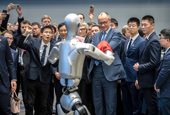 Zu Besuch bei Unitree Robotics in Hangzhou: Am 26. Februar führt Gründer und Geschäftsführer Wang Xingxing (links) Bundeskanzler Merz durch den Showroom. Das Unternehmen ist bekannt für seine humanoiden Roboter.