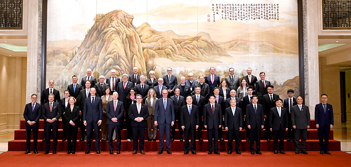 In Hangzhou posiert Bundeskanzler Merz mit chinesischen und deutschen Wirtschaftsführern. Die Tech- und Tourismus-Metropole in der Provinz Zhejiang war nach Beijing die zweite Station des Kanzlerbesuchs in China.