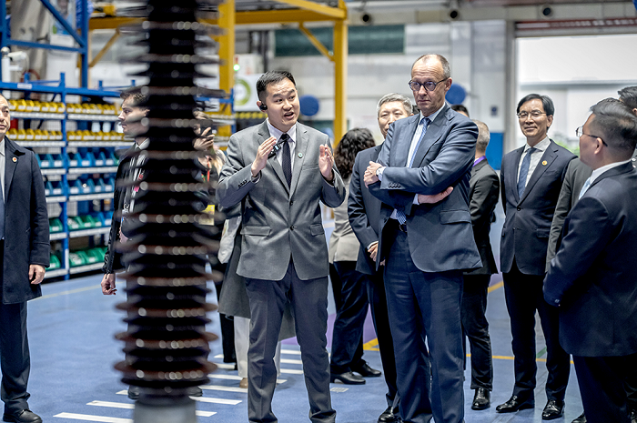 Kooperationsfeld Energietechnik: Bundeskanzler Merz wird von einem Werksleiter durch die Produktionsha len von Siemens Energy Hangzhou geführt.